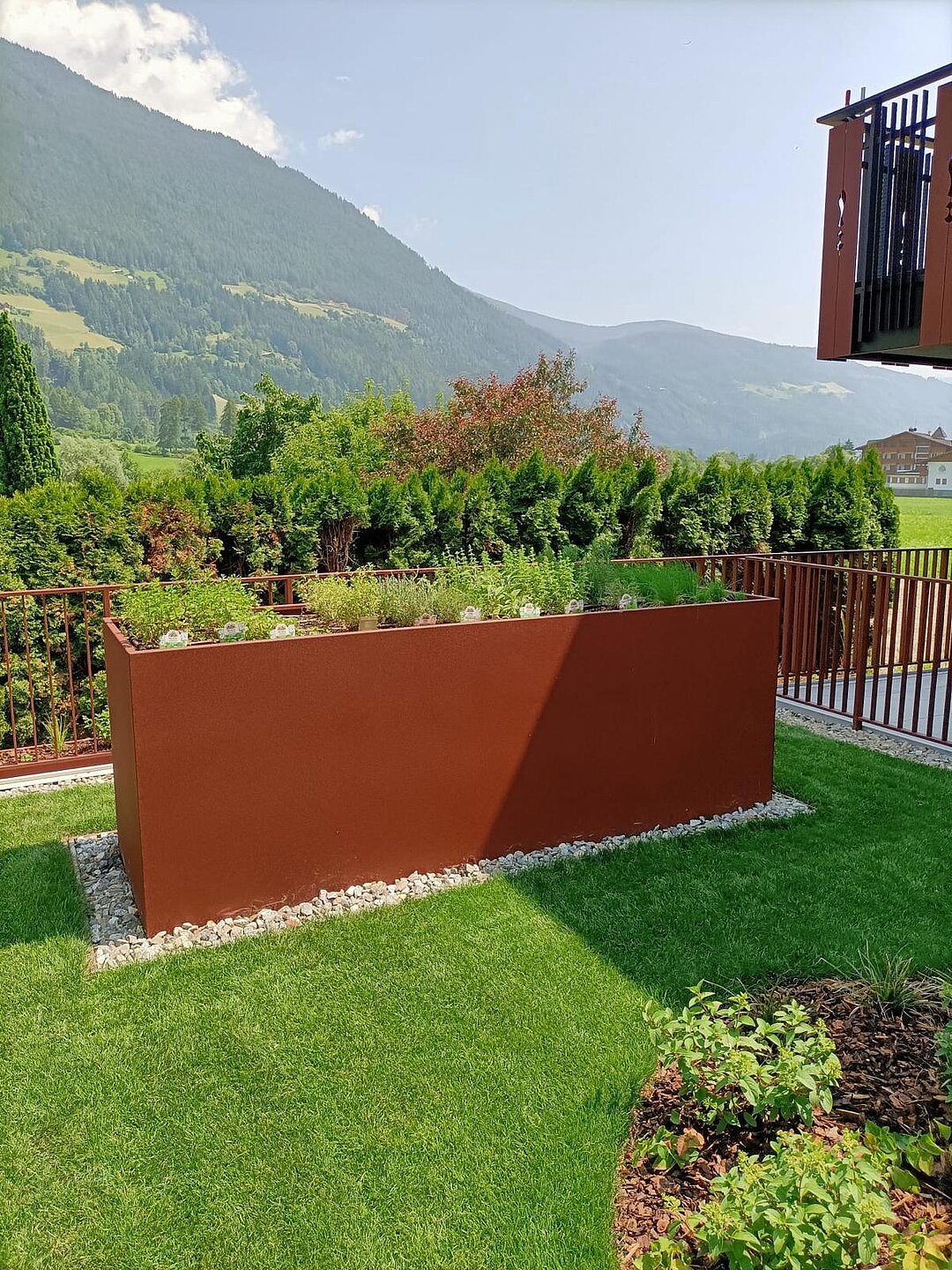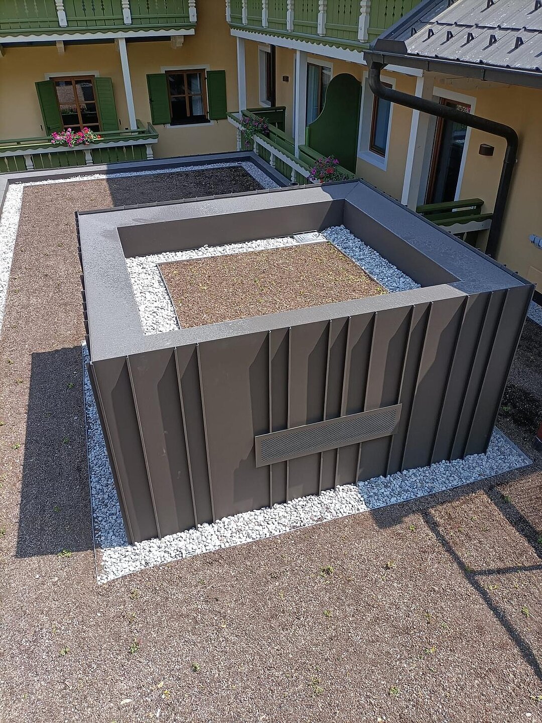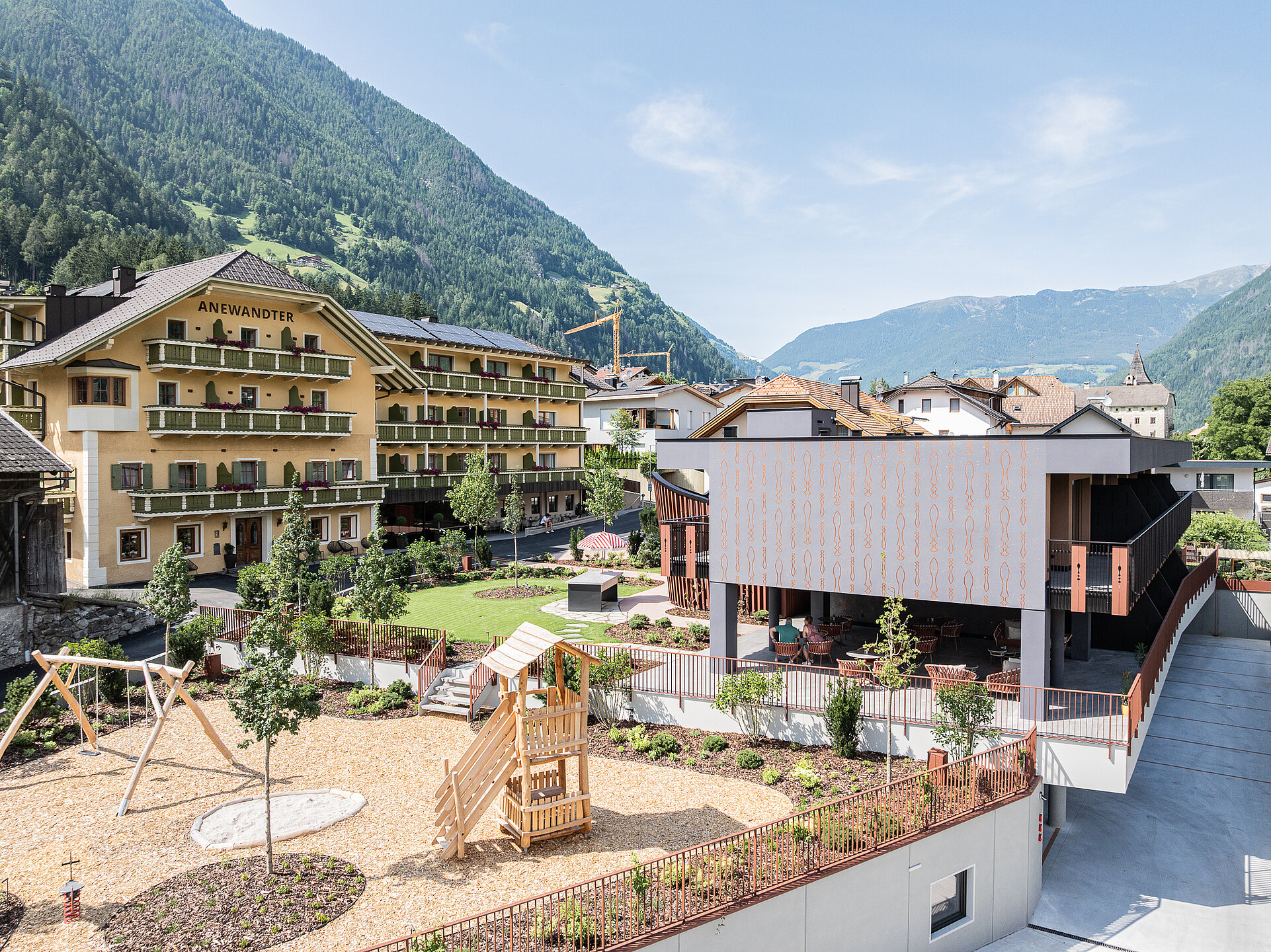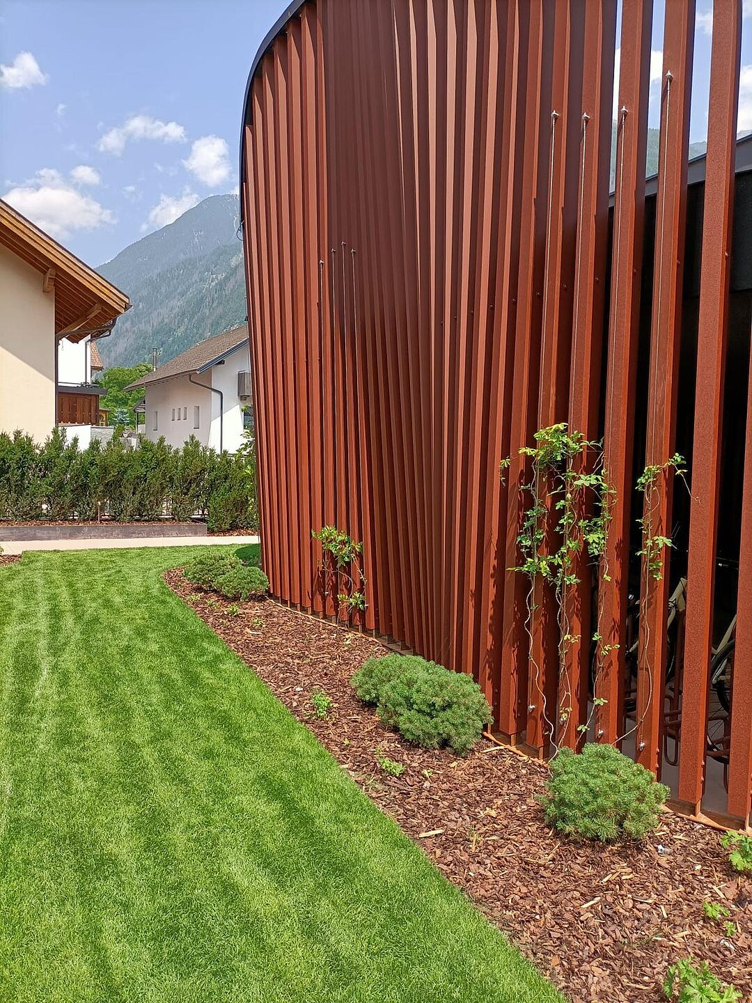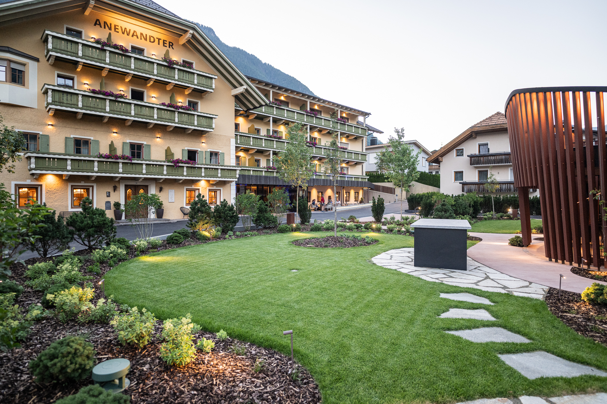Die Herausforderung: Unterschiedliche Untergründe erforderten maßgeschneiderte Lösungen. Während die Flächen über der Tiefgarage nach dem System für intensive Dachbegrünung bzw. Verkehrsdächer aufgebaut wurden, konnten die erdgebundenen Bereiche klassisch aufgebaut werden. So entstanden rund um das Hauptgebäude vielfältige Nutz- und Aufenthaltszonen: ein Spielplatz, Relaxbereiche für Saunagäste, Freizeitflächen mit Tischtennis und ein ruhiger Innenhof mit Lounge-Charakter.