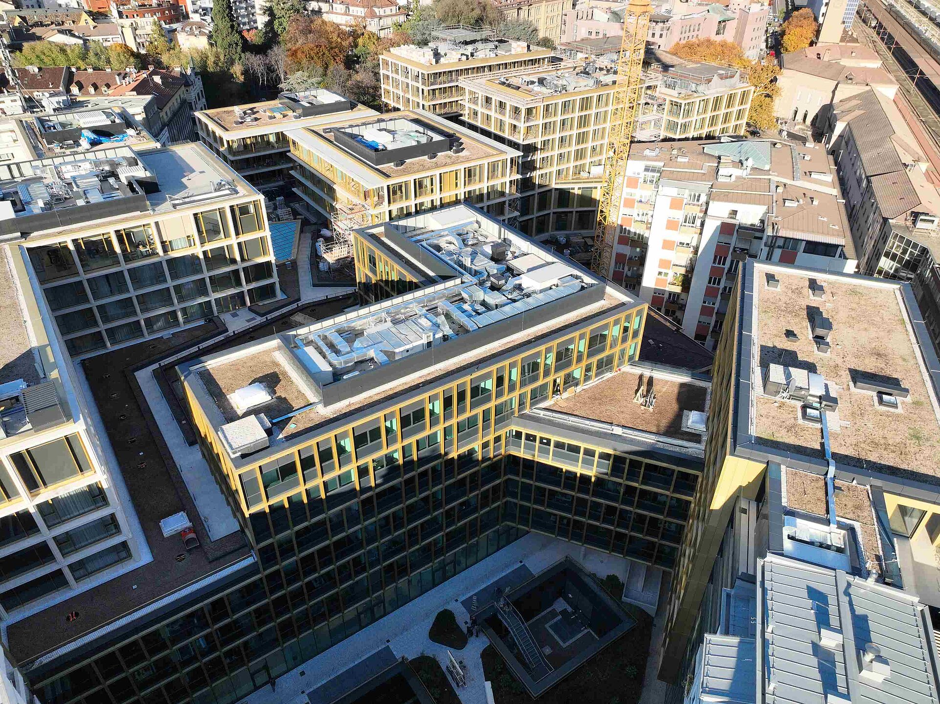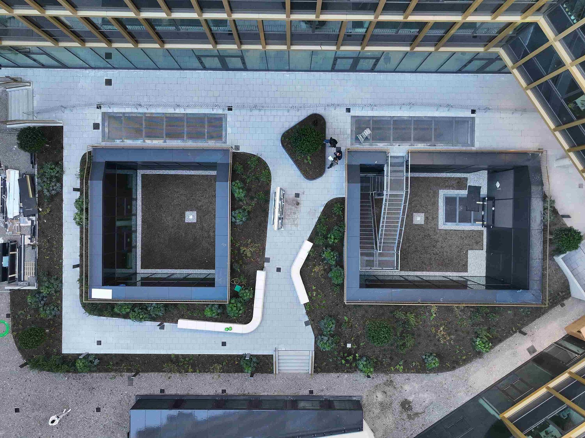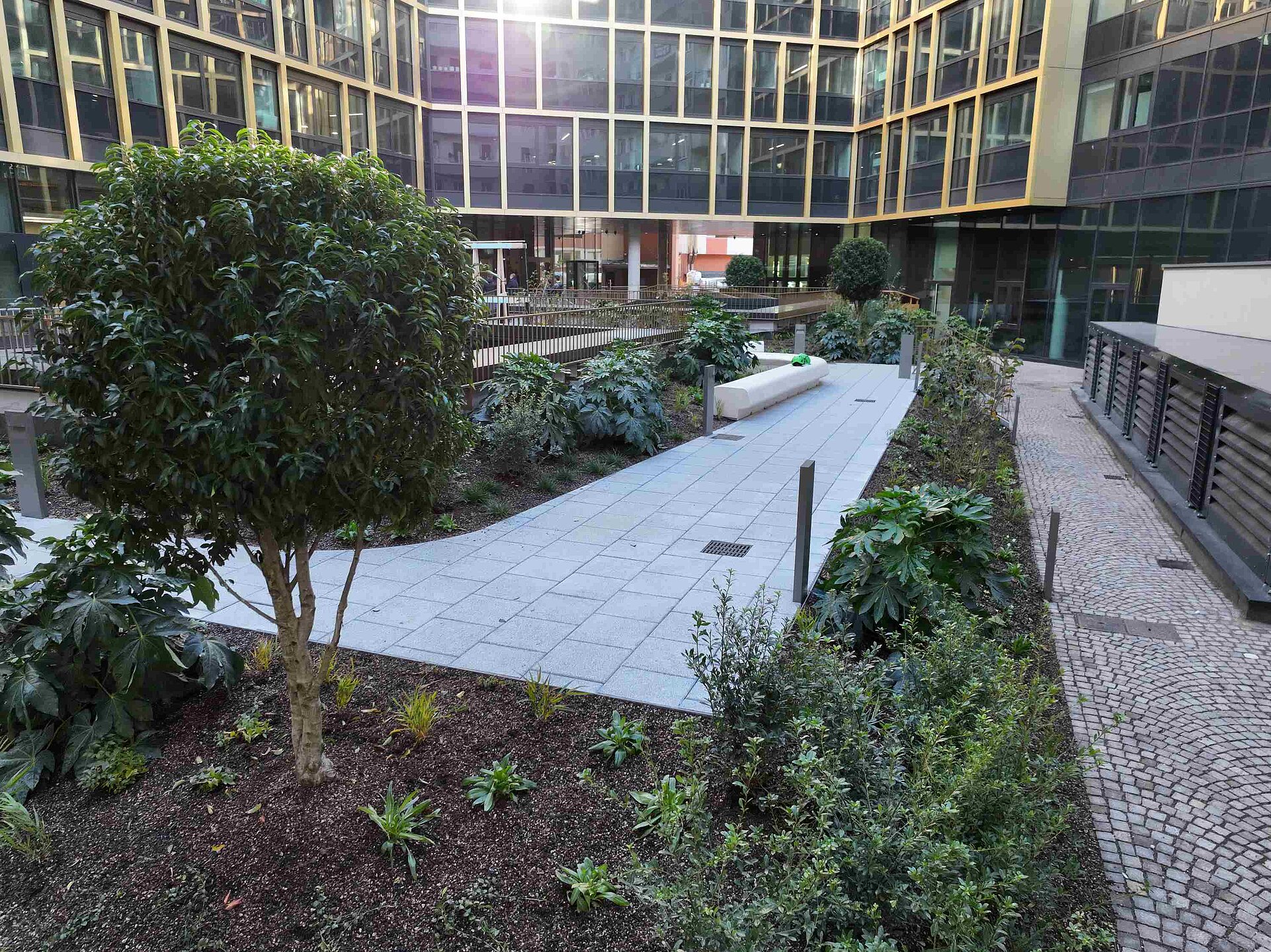 Auf mehreren Ebenen können Besucher auf Dachterrassen einen Aperitivo oder den Blick über die Stadt genießen. Die Technikdächer sind mit einfachen extensiven Dächern begrünt. Und die Innenhöfe sind mit attraktiven mediterranen Pflanzen als intensive Gärten über der Tiefgarage aufwendig gestaltet worden, sodass Besucher, Hotelgäste und Bewohner gleichermaßen von Grün umgeben sind.