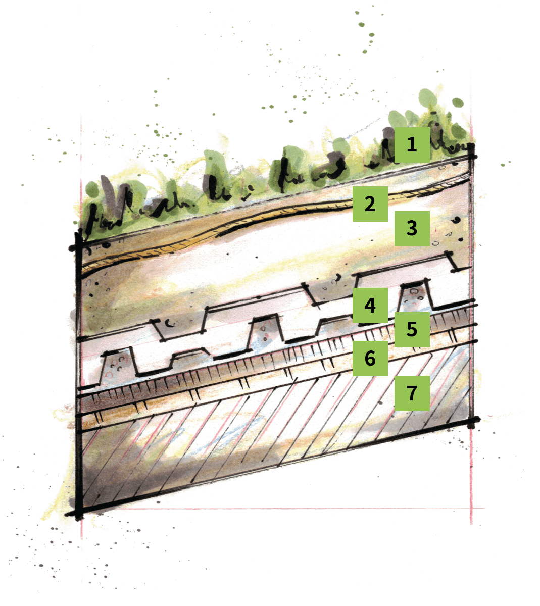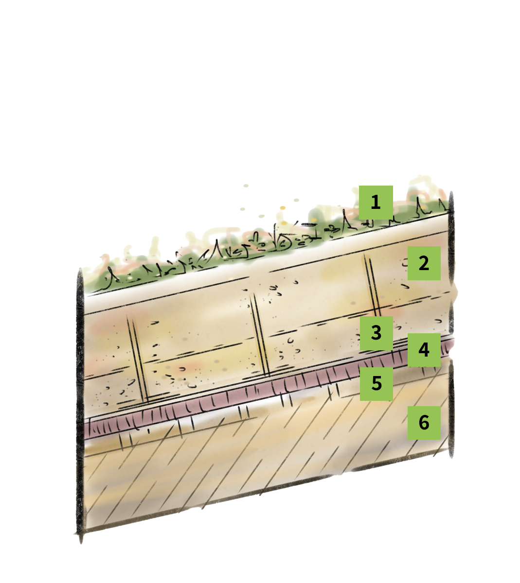 - Aufbau ist nicht UNI 11235 - konform, entspricht allerdings den technischen Voraussetzungen gem. FLL- Dachbegrünungsrichtlinie